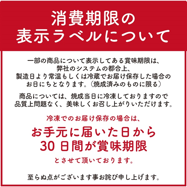 冷凍でのお届け保存の場合は、お手元に届いた日から 30 日間が賞味期限とさせて頂いております。