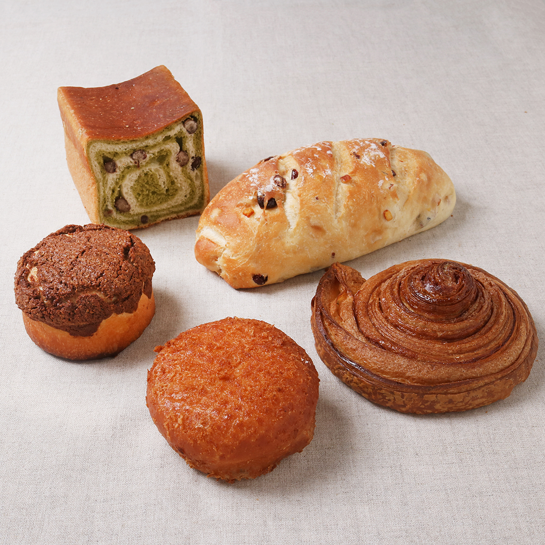 ・グルマンゴールド食パン6枚切 ・全粒粉食パン ・ぎっしりクルミのフランスパン ・毎日食べたいマフィン ・モーニングセット ・もちもちちぎりパン